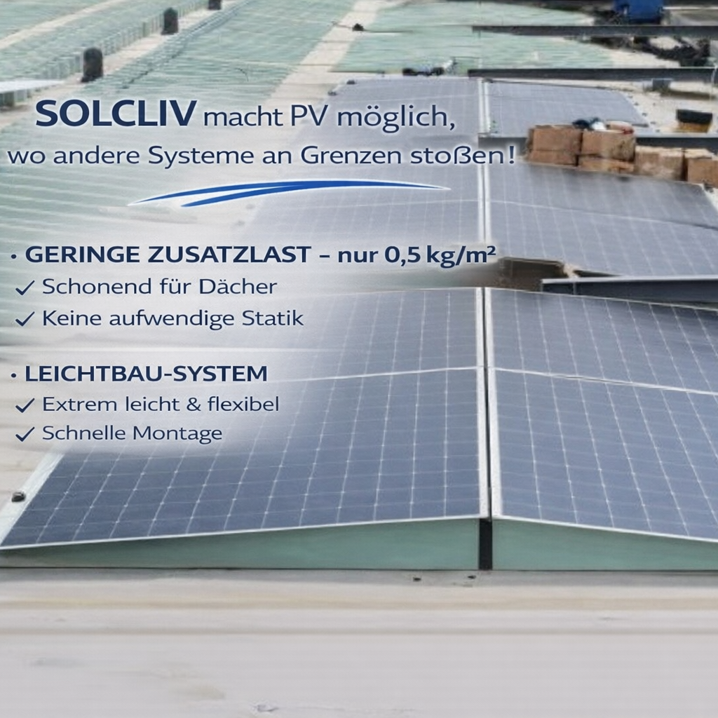 Viele Hallen- und Gewerbedächer sind statisch limitiert oder sensibel in der Dachhaut. SOLCLIV wurde genau dafür entwickelt: eine patentierte Unterkonstruktion für Leichtmodule, die in vielen Fällen eine wirtschaftliche Belegung ermöglicht, wenn ballastierte Standardlösungen komplex werden.